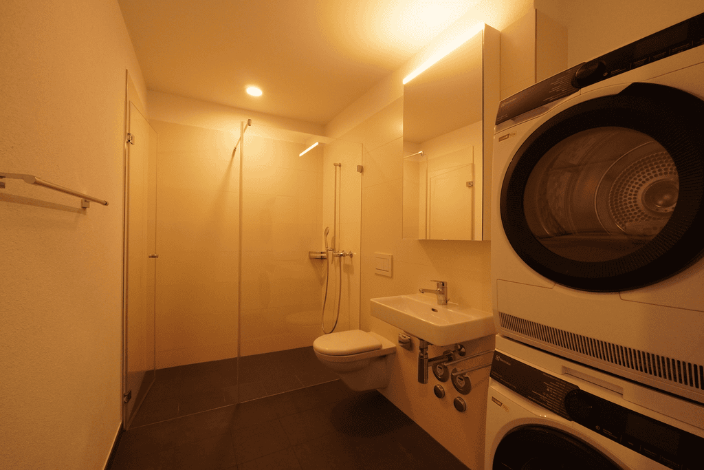 Jede Wohnung verfügt über den eigenen Waschturm im Badezimmer.