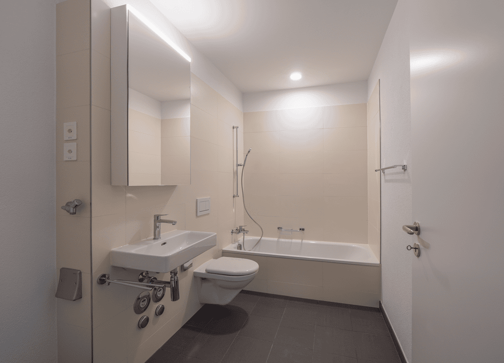 Jede Wohnung verfügt über den eigenen Waschturm im Badezimmer.